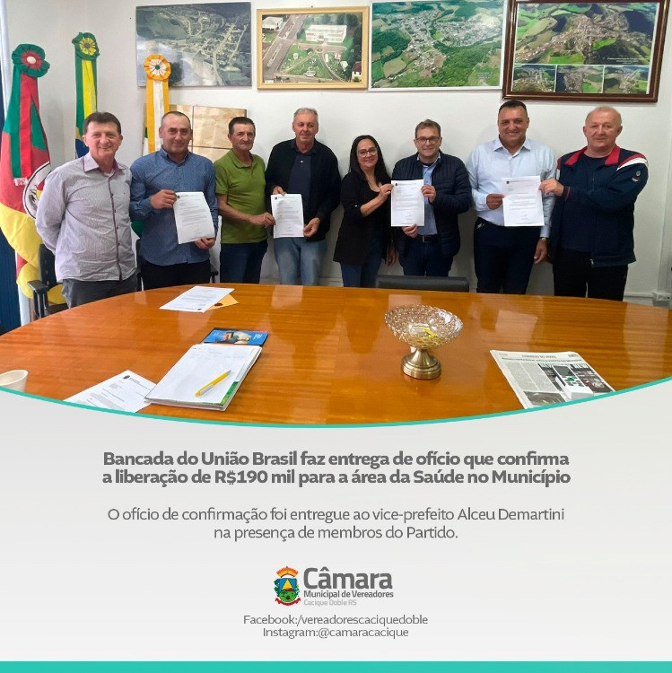 Nesta terça-feira (17), os vereadores Cláudio Fortuna, Lucimar Calgaroto e Idalir Signorati Mioranza receberam o assessor do Deputado Federal Carlos Busato que confirmou a destinação de R$ 190 mil, através de emenda parlamentar, para o Município de Cacique Doble. O valor será utilizado no financiamento de ações na área da saúde, ajudando a ampliar e qualificar o atendimento oferecido à população.