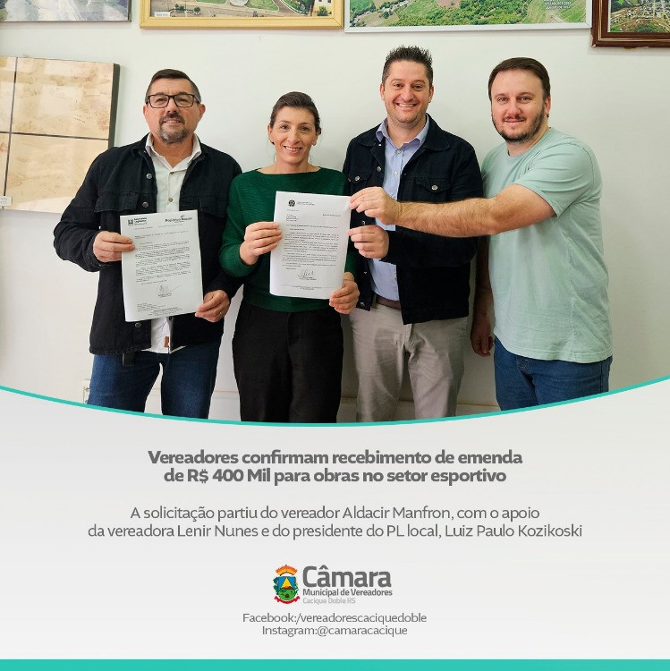Na manhã desta quarta-feira, 18 de junho, o município de Cacique Doble celebrou a confirmação de uma conquista significativa: a destinação de uma emenda parlamentar no valor de R$ 400.000,00, voltada à construção, reforma e ampliação de estruturas voltadas ao esporte. O repasse é resultado de uma articulação entre o deputado federal Osmar Terra e o deputado estadual Paparico Bacchi.