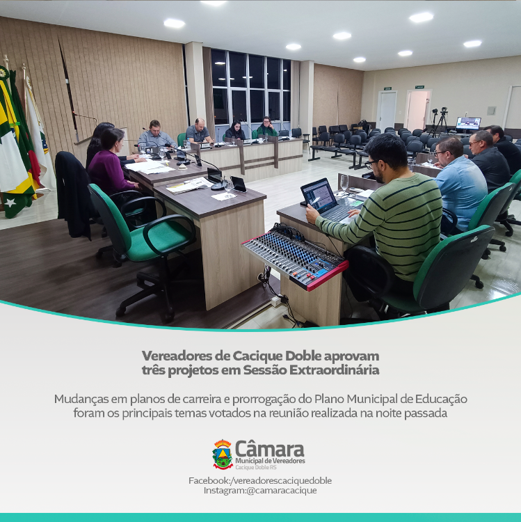 Na noite desta quarta-feira, 16 de julho, os vereadores de Cacique Doble realizaram Sessão Extraordinária, convocada pelo Executivo Municipal. A pauta da reunião incluiu a votação de três projetos de lei relacionados à administração pública e à área da educação.