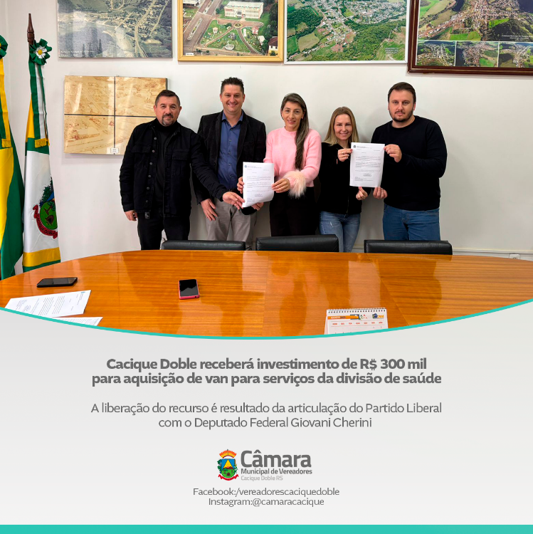 Na manhã desta quinta-feira, 07 de agosto, foi anunciado um importante investimento para a área da saúde do município de Cacique Doble. Por meio de uma emenda parlamentar destinada pelo Deputado Federal Giovani Cherini, o município receberá R$ 300 mil que serão utilizados para a aquisição de uma van destinada ao transporte de pacientes e apoio aos serviços da saúde municipal.