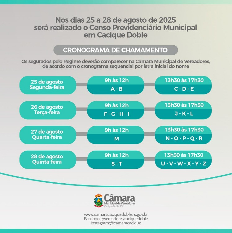 O Censo será realizado de 25 a 28 de agosto de 2025 na Câmara Municipal de Vereadores conforme cronograma de atendimento que segue a ordem da inicial do nome: