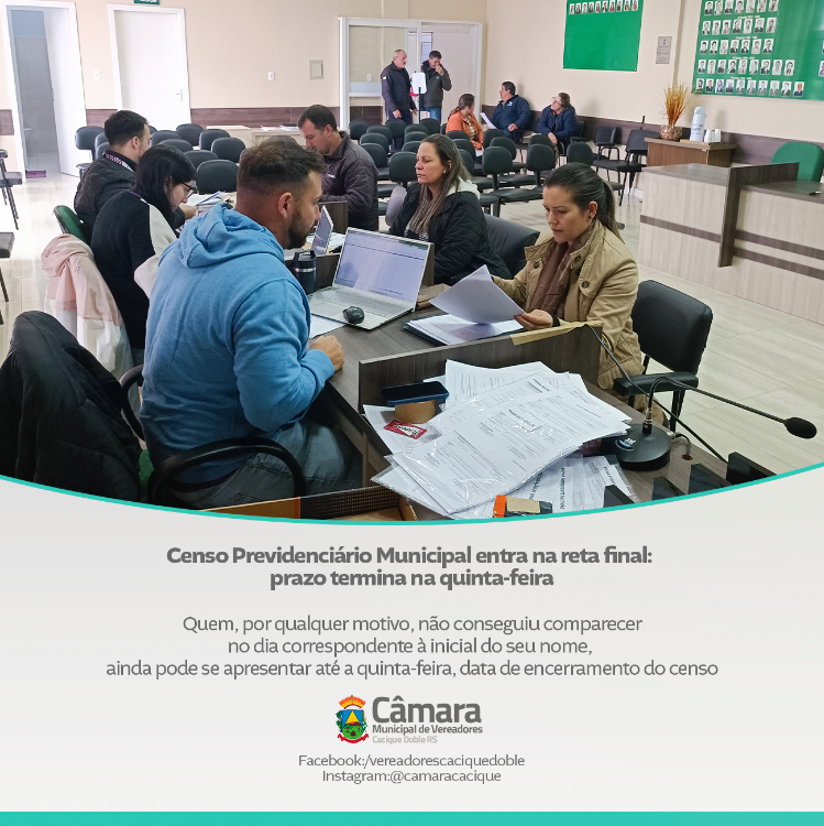 Desde segunda-feira (25), servidores públicos vinculados ao Regime Próprio de Previdência Social (RPPS) de Cacique Doble participam do Censo Previdenciário Municipal 2025. A ação acontece na Câmara Municipal de Vereadores até esta quinta-feira, 28 de agosto. O recadastramento é obrigatório e somente para os servidores ativos, aposentados e pensionistas, e o não comparecimento implica na suspensão da remuneração ou benefício, com restabelecimento apenas após a regularização.