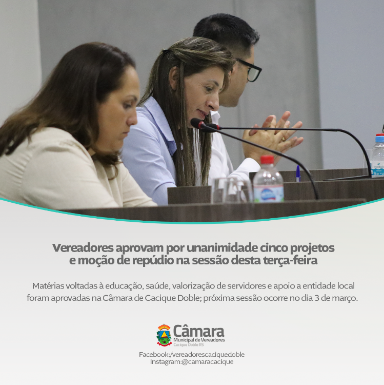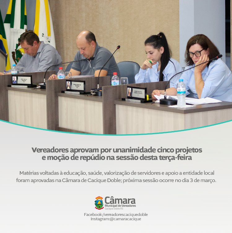 A próxima sessão ordinária da Câmara Municipal de Vereadores de Cacique Doble está marcada para a terça-feira, dia 3 de março.